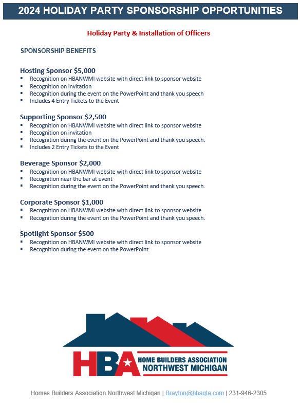 Come celebrate the holidays at the HBA NWMI Holiday Party and Installation of Officers at Delamar Traverse City, on December 11th.