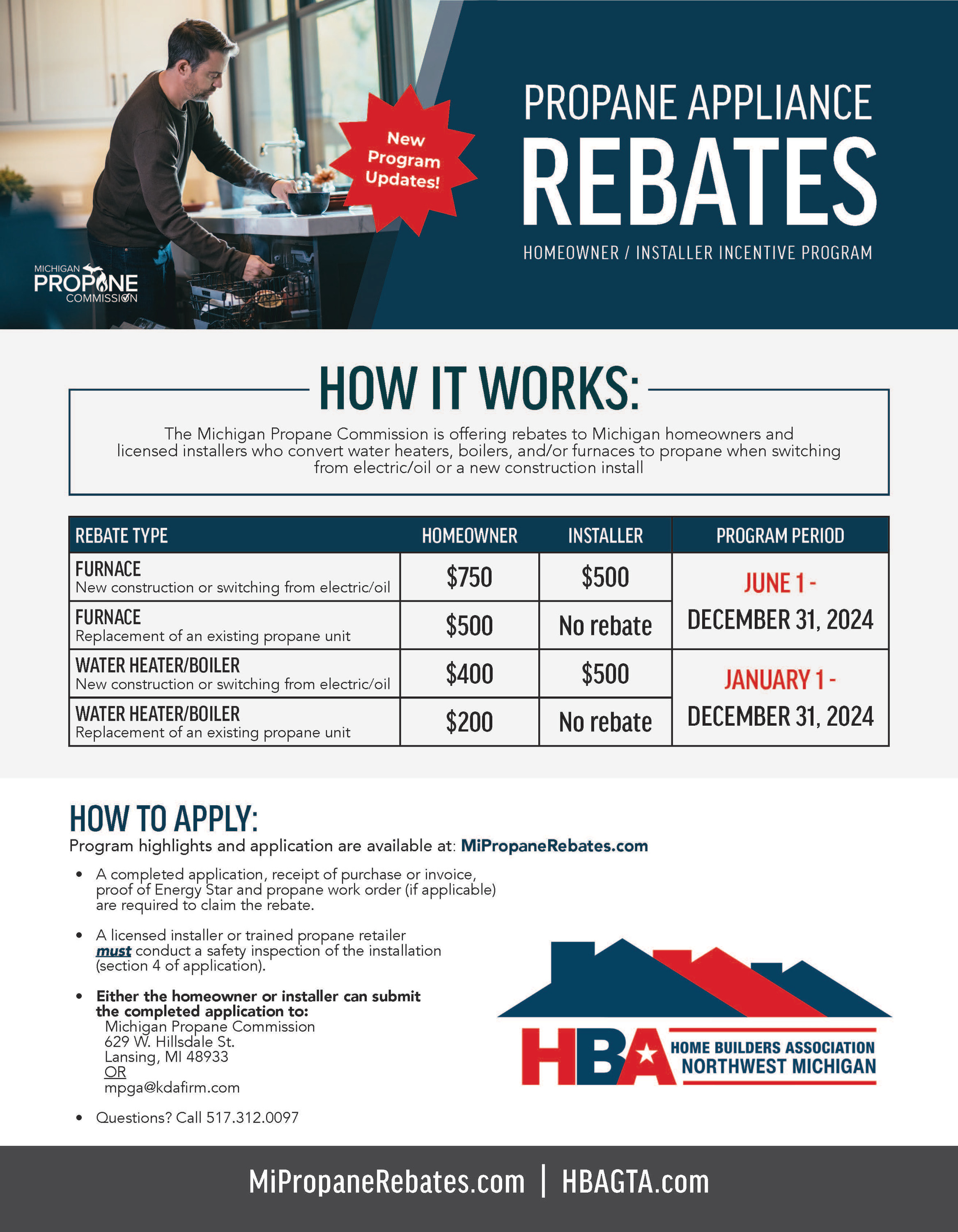 The Michigan Propane Commission offers Michigan residents and licensed installers, builders, etc., propane appliance rebates. Homeowners can receive up to $1,150 and installers can receive up to $1,000 for installing new Energy Star propane furnaces, water heaters, and/or boilers. Visit MiPropaneRebates.com to learn more or call out Rebate Team at 517-312-0097.